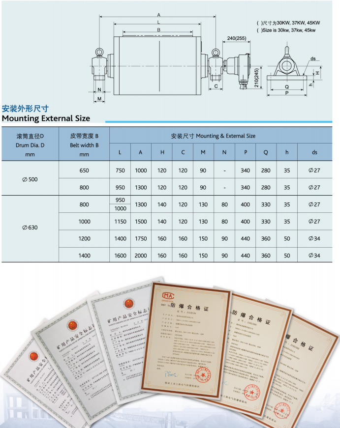 YDB隔爆型油冷式電動滾筒按GB3836.1—2000《爆炸性氣體環(huán)境用電氣設(shè)備 第一部分:通用要求》、GB3836.2—2000《爆炸氣體環(huán)境用電氣設(shè)備 第二部分:隔爆型“d”》的要求,設(shè)計制造成隔爆型、防爆標志為Exd I,適用于煤礦(非采掘工作面)含有爆炸性氣體混合物的場所,安裝尺寸符合行業(yè)標準,作為膠帶輸送機的一種新型驅(qū)動裝置,與防爆電機+減速器+轉(zhuǎn)動滾筒形式的傳動裝置比較有明顯的優(yōu)點,它的結(jié)構(gòu)緊湊、安裝安全、操作方便、外形美觀。 |